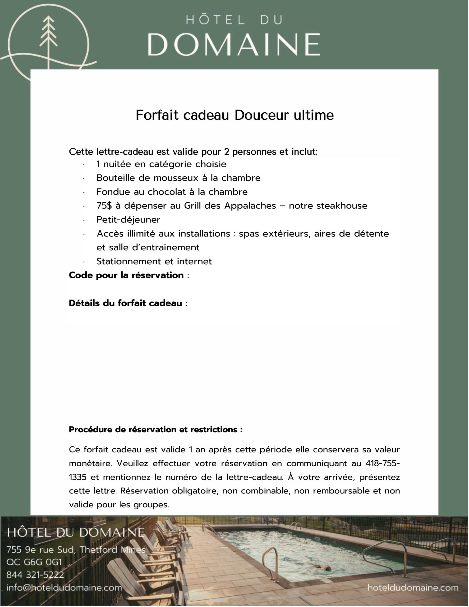 Il est possible de modifier ou d’annuler votre réservation avant 15h00, 2 jours précédant votre arrivée. À défaut de s’y conformer, la première nuit sera portée à votre compte de carte de crédit. Renseignez-vous sur notre assurance annulation lors de la réservation d’un forfait directement avec nous. Pour les réservations de groupe, vous devez respecter les délais d’annulation inscrits sur votre entente signée.